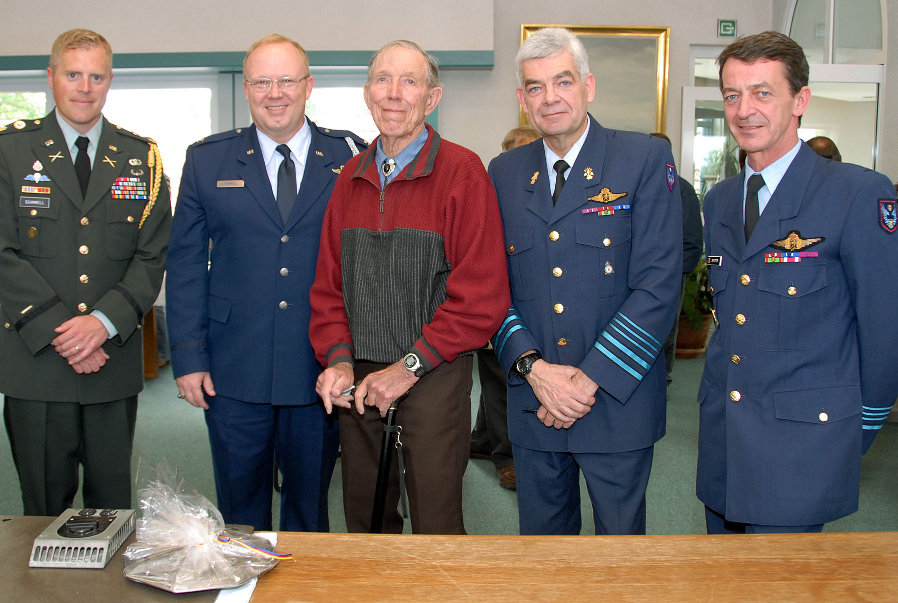 After lunch, Edward was taken by army and navy jeeps to to the Grimbergen townhall where, unknown to him, were roughly 50 people waiting to thank him for his service. This included local television, U.S. Embassy, Belgian Air Force, the vice-mayor, many who were present at the crash as well as many many well-wishers. There, he was given a plaque from the City by the vice-mayor, allowed to sign a piece of armor from the Hard Seventeen and given a flight-suit temperature regulator from the plane.
